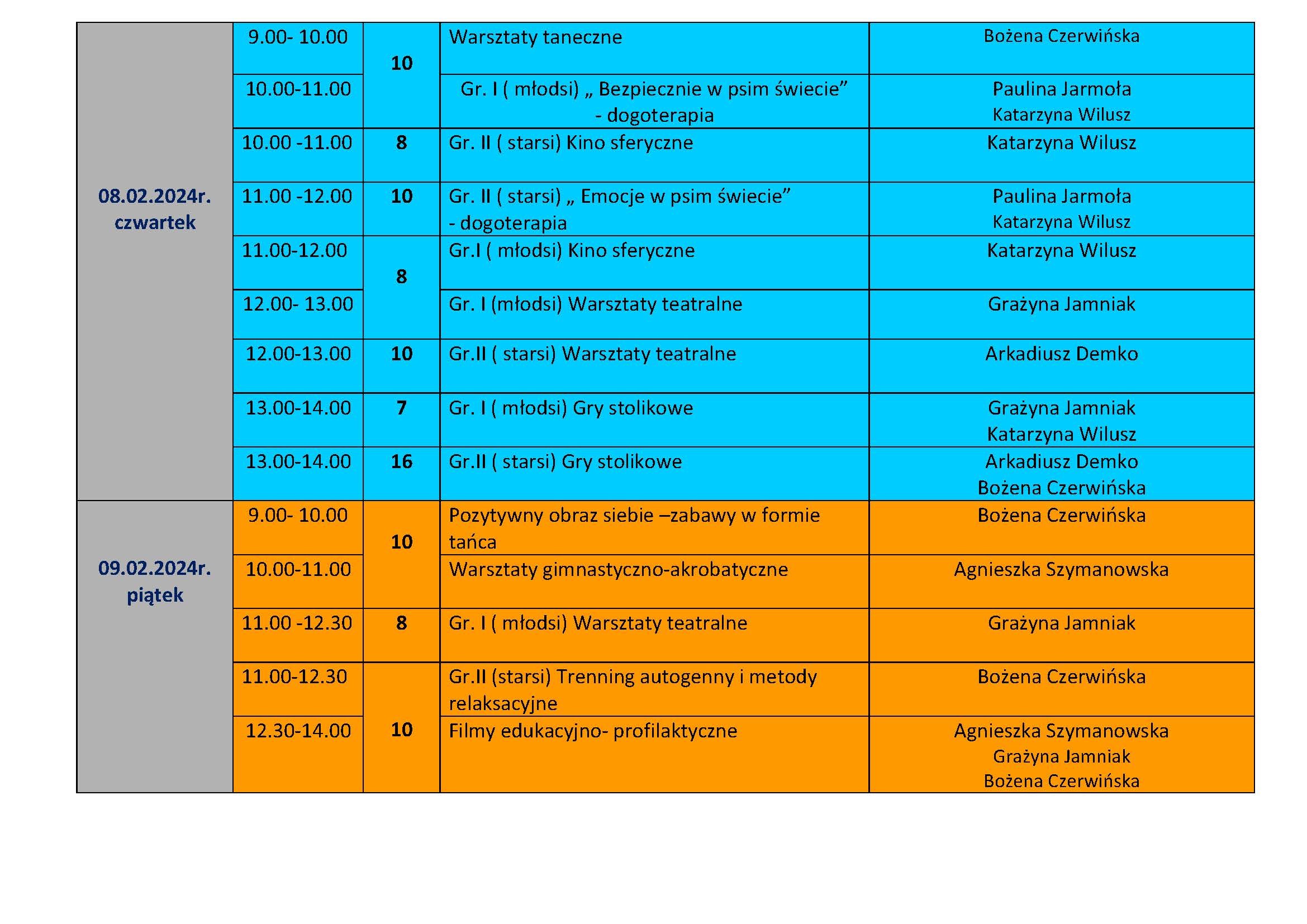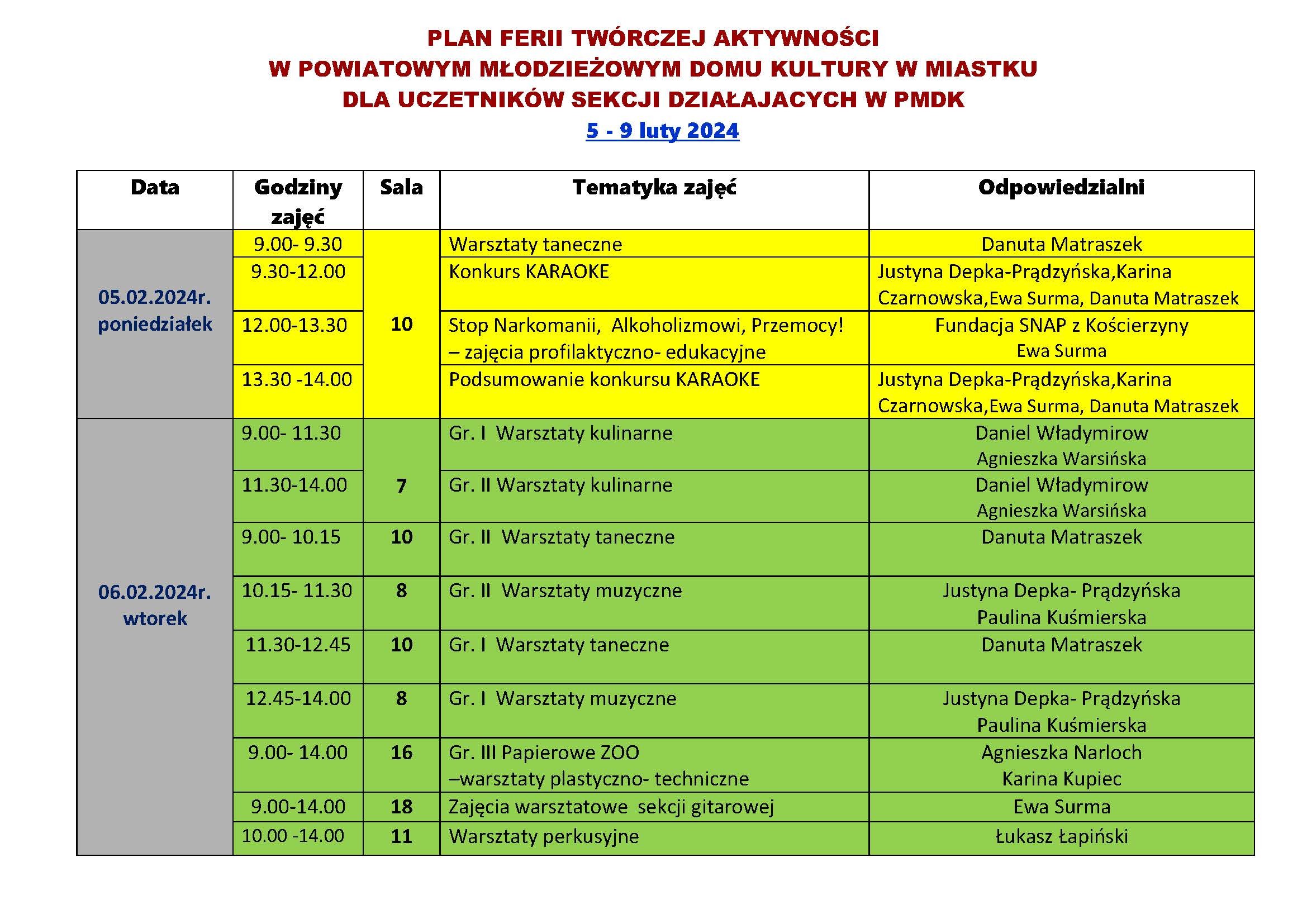 Ferie 2024 - harmonogram - oferta tylko dla stałych uczestników sekcji